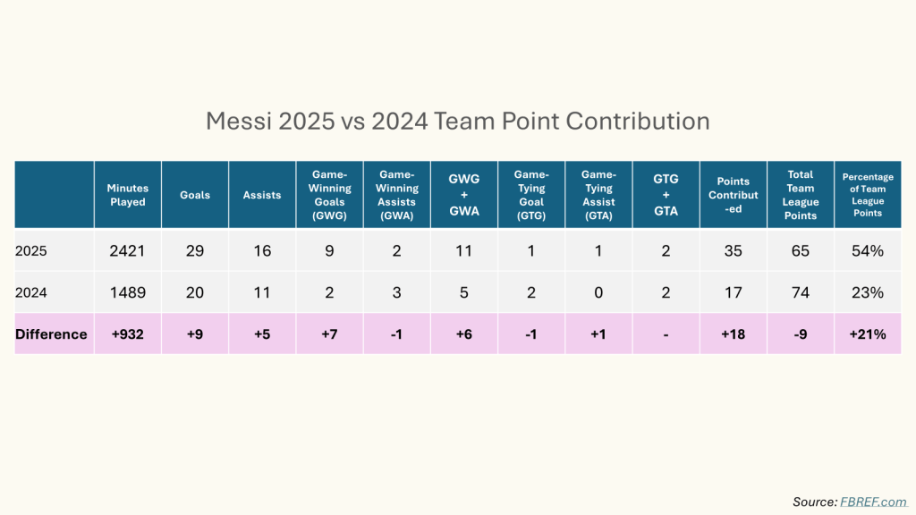 Not only did Messi score more goals and register more assists in 2025, he also more directly contributed to Inter Miami’s league table points. He was involved in six more goals that were game winners which means he was directly involved in helping Miami win 18 more points this season, contributing to a total of 35 points which is double the number he contributed to last season. This is also means he was directly involved in helping Miami secure more than half of their league points in a season where they were competing to win the Supporter’s Shield. Last season, Messi was only involved in less than a quarter of the team’s points.