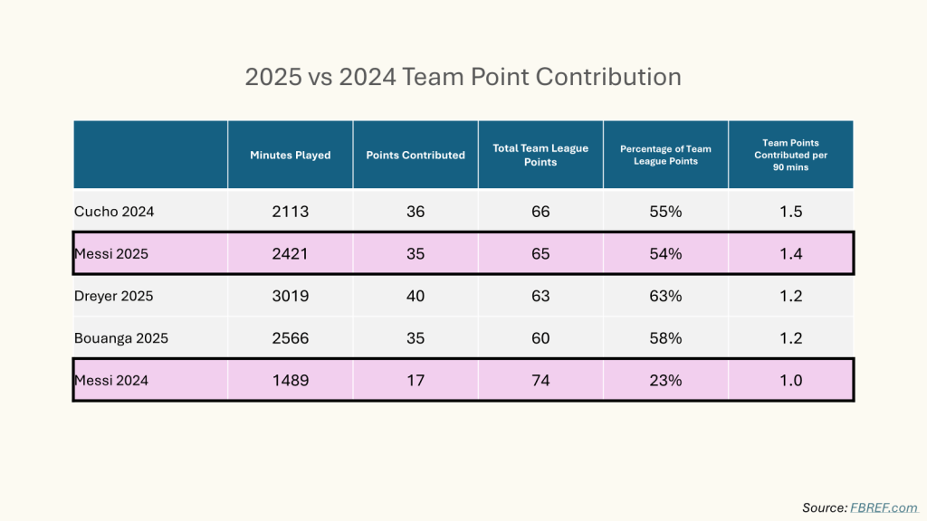 When we adjust for per 90 minutes, we see a similar story. In 2025 Messi was directly involved in a average of 1.4 team points per 90 minutes – higher than his average of 1.0 team points per 90 last season. The only player with a better per 90-point contribution is Columbus’s Cucho in 2024, who had a 1.5 average which resulted in 36 points contributed or 55% of Columbus’s 2024 league points.