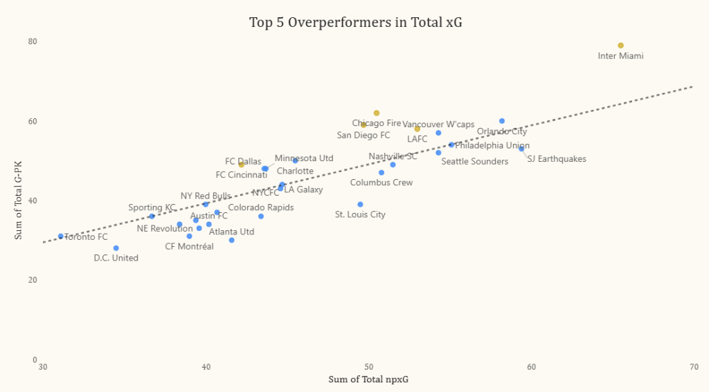 Looking back at the regular season, we see that Inter Miami led the league in terms of overperforming their expected goals by double digits in the 2025 season.
