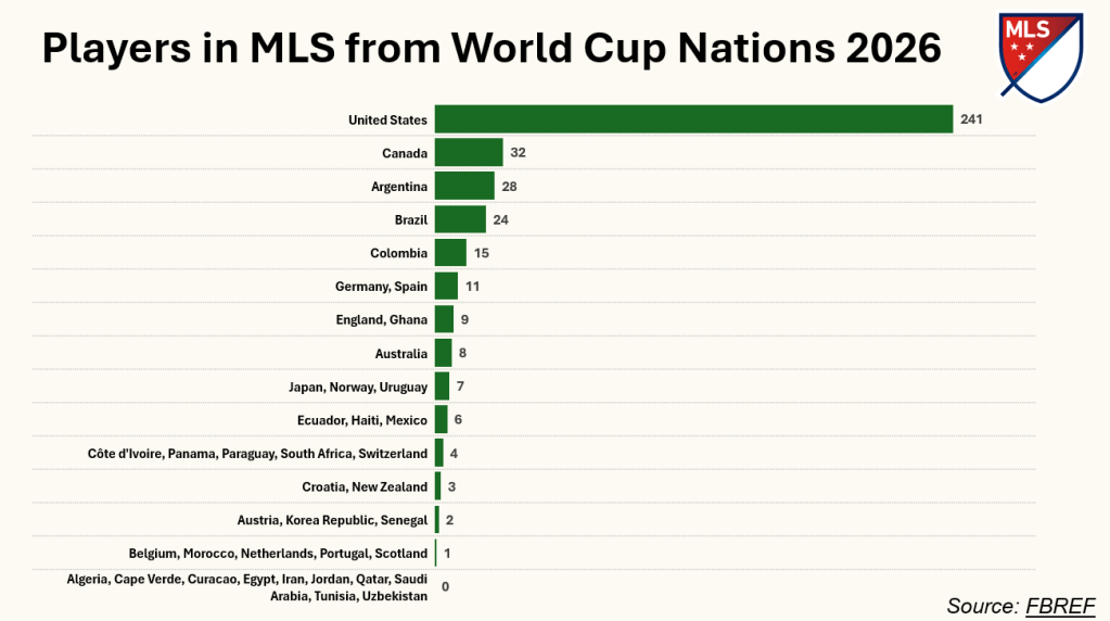 Looking ahead to the 2026 World Cup, I thought it would be interesting to see how well each of the competing nations are represented in MLS. No surprise, the US leads overall followed by fellow host Canada: #MLS #Data #FIFAWorldCup #WC26