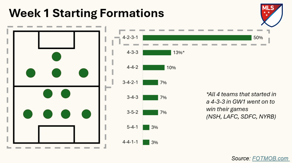 Looking at Week 1 starting lineups, the 4-2-3-1 seems to be the prevailing formation in MLS. Fun side note that every 4-3-3 lineup won their game this week all against the 4-2-3-1! #MLS #Soccer #Data #Tactics